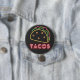 Das Button "Spaß" für Feinschmecker zeigt den neonroten "Tacos"-Text mit neon knackiger Muschel-Taco-Silhouette auf schwarzem Hintergrund. Wer Liebe keine Tacos?