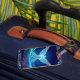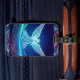 Ein wunderschönes Foto eines Neonengels auf einem Gitterfundament mit dunkelblauem Hintergrund. Machen Sie Ihr Gepäck leicht zu identifizieren.