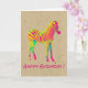 Eine Geburtstagskarte mit einem flippigen, Sechziger reden psychedelische Illustration eines Baby Zebra in den Neonfarben des hellen Gelbs, des Pinks und des Minzengrüns an. Wild und Spaß mit einem kreativen künstlerischen Flair. Set auf einem Imitathandwerks-Papierhintergrund. Die Front sagt, dass alles Gute zum Geburtstag und das Innere der Karte eine Mitteilung hat, die Sie besonders anfertigen oder verlassen können, wie ist.