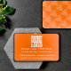 Visitenkarte in neonorange soliden Hintergrund und ein einfaches Cover Logo. Personalisieren Sie die Front jetzt. Die Rückseite ist mit einem geometrischen Musterdesign bedeckt. Das moderne und trendige Design stammt von Alma Wad . Standard australische / japanische Visitenkartengröße.