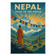 Retro Vintage Reiseplakat von Nepal, feiert seinen Titel als Dachs der Welt. Foreground: ein buddhistischer Mönch in traditionellem Safranfelsen, stehend auf einem Felsvorsprung, der auf den Himalaya blickt, mit farbenfrohen, flatternden Gebetsfahnen, die sich über den Himalaya erstrecken