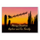 Eine Weihnachtskarte für Ihren Neffen und seine Familie, die dem Weihnachtsmann zeigt, der über die Wüste fliegt. In der Silhouette sind viele große Kakteen zu sehen. Wünschen Sie ein frohes Weihnachtsfest aus der Wüste mit einer schönen Sonnenuntergang farbenen Karte.