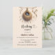 Für ein Party zum Thema Babydusche. Die Einrichtung ist mit einem Vogelnest im Bohustyp dekoriert. Beigefarbener Hintergrund. Personalisieren und hinzufügen von Namen und Party-Details.