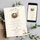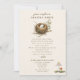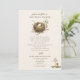 Nature Storybook Seite inspiriert Nisting Party Babydusche Einladung mit Darstellung eines Vogelnestes mit weißem gesprenkeltem Ei. Das Pilzdesign ganz unten rechts.