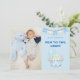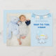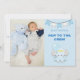 Verkünden Sie mit seinem Foto die Ankunft Ihres wertvollen Babys in stilvollem Stil mit der links und Typografie in blau rechts neben der Crew New To The, die Sie ganz einfach in Ihre eigenen Worte ändern können, wenn Sie es wünschen, sowie die Details auf der Rückseite. Ein niedlicher Elefant, der einen Ballon hält, ist auch vorne und faht oben, mit einem blassblauen Hintergrund mit Sternmuster.