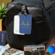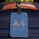 Chic, modern und einfach mit Monogramm Gepäckanhänger mit dem Text Mr. und Mrs. in weißer eleganter handgeschriebener Schrift Kalligraphie auf klassisch blauem Hintergrund mit Ihrem Monogramm in Gold. Fügen Sie einfach Ihren verheirateten Namen, Jahr etabliert und Monogramm in stilvoller Typografie hinzu. Perfektes Luxusgeschenk für die Hochzeitsgäste eines frisch verheirateten Paares. Exklusiv für Sie entworfen von Happy Dolphin Studio. Wenn Sie Hilfe oder passende Produkte benötigen, kontaktieren Sie uns bitte unter happydolphinstudio@outlook.com. Wir helfen Ihnen gerne, Ihre Hochzeit zum schönsten Tag zu machen!