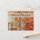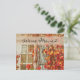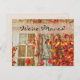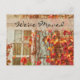 Der Herbst lässt rustikales Land Wir haben bewegte Ankündigung Postkarte verschoben. Senden Sie Ihre neue Adresse an Familie und Freunde. Schöne Farbtöne von orangefarbenen, roten und gelben Blätter, die auf der Hausseite aufklettern. Vintages Retro-antikes weißes Fenster und blauer Verschluss. Das Foto ist aus braunem Ziegelstein.