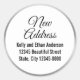 'Neue Adresse' erscheint oben in einem schwarzen Skript. Sie können das Skript bearbeiten, falls gewünscht. Unter dem Skript befinden sich weitere Zeilen mit Anzeigetext. Sie können sie bearbeiten, um Ihren Namen und Ihre neue Adresse anzuzeigen. Der Text ist in einem weißen Kreis mit einem silbernen Imitat (nicht Folie). Dies ist ein großartiger Aufkleber, um Weihnachtskarten und Umschläge hinzuzufügen, um jedem lassen wissen, dass Sie bewegt haben.