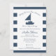 Set segelt auf einem neuen Abenteuer, um Baby mit unserem marineblauen Segelboot und nautischen Streifen elegante und klassische Baby Dusche Einladung für Mama und Papa zu sein. Personalisieren Sie wie gewünscht.