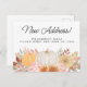 Bewegst du bald Zuhause? Diese floralbewegende Postkarte ist mit Wasserfarbenkürbis, Laub und Blume geschmückt. Es steht "New Address" in stylish script typografie. Einfach anpassbar. Original Wasserfarbe © Michele Davies.