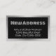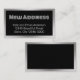 Diese schwarz-silberne Adressenänderung kann mit Ihrem gewünschten Text personalisiert werden. Oben befindet sich ein großer Darstellungstext (angezeigt: Neue Adresse). Dann gibt es drei Zeilen Text zur Anzeige für Ihren Namen und Ihre Adresse. Der Text ist weiß. Der silberne Aussehrahmen ist nicht aus Folie.