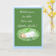 Eine "Willkommenskarte" für einen neuen kleinen Jungen, mit einem schlafenden Baby und weißen Schriftzügen auf dunkelgrünem Hintergrund, umgeben von Blau.