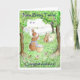 Eine "New Baby Twins" Gratulationskarte mit einem Kaninchen, das die Wäsche auf der Schlange hängt, und einer Gruppe kleinerer Kaninchen, die die Neuankömmlinge in ihrem Kinderwagen bewundern. Aus einer handgemalten Aquarellfarbe von Judy Adamson. Bleiben Sie drinnen für Ihre eigene Nachricht.