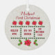 Neue Babygeburt steht für Weihnachtsschmuck im Foto. Das Design zeichnet sich durch den Namen des Babys an der Spitze und die Geburtsdaten am unteren Ende aus. Die erste Weihnachtsschmuckdekoration kann mit dem Namen des Babys, dem Jahr und einem Foto an der Vorderseite abgestimmt werden.