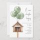 "Ein neues Kapitel" Babydusche Thema mit Darstellung einer Mini-Nachbarschafts-Leihbibliothek mit grünen Ballons und weißem Hintergrund.