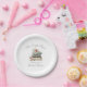 Ein süßer Pappteller für ein Baby- oder Hochzeitsbrunch mit einem buchthematischen Feiermotiv. Das Design zeigt den Satz "Ein neues Kapitel beginnt" in eleganter Schwungschrift, kombiniert mit klassischen Serifenschriften, sowie einen Wasserfarben-Stapel aus drei Büchern in Tönen von Beige, Grau und Grün. Die Bücher sind mit Wildblumen und Grüntönen in Rosenholz, Gelb, Blau und Lila akzentuiert, was eine weiche und fröhliche Note verleiht.