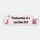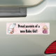 Ein Autoaufkleber mit hellrosa Untergrund, verstreut mit Herz und digitalen Illustrationen eines hübschen Weißstorchs und eines niedlichen kleinen Mädchens. Der Text lautet "Proud Eltern eines neuen Babys Mädchen", aber Sie können das anpassen, wie auch immer Sie gewollt.