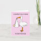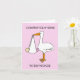 Ein Cartoon eines Storchs, der ein Mädchen in einem Blatt hält, das vom Schnabel des Storchs hängt. Die Worte "Herzlichen Glückwunsch an beide Vater begleiten das Bild.