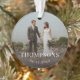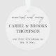 Gedenken an die neue Braut und den Bräutigam mit einem Ornament mit einem Foto, Familienname und Hochzeitsdatum auf der Vorderseite. Auf der Rückseite steht "verheiratet und fröhlich" mit dem vollen Namen der Paare und "unsere ersten Weihnachten als Mr. and Mrs."