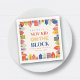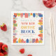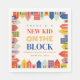 "New Kid On The Block" Babydusche Thema mit Text in der Mitte mit bunten Häusern Nachbarschaftsgrenze.