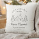 Ein gemütliches, quadratisches Kissen mit einer puristischen Line-Art-Hütte mit Kiefern und Schneefall unter dem Bogen "Erste Weihnachten in unserer neuen Zuhause". Ein neutrales Schwarz-Elfenbein-Kunstwerk verbindet sich mit modernen oder Bauernhäusern. Fügen Sie Namen und Jahr hinzu, um einen einladenden Akzent für Sofa, Einstiegsbank oder Gästezimmer zu schaffen - auch ein nachdenkliches Geschenk für neue Hausbesitzer.