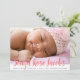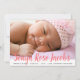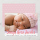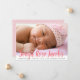 Neugeborene Mädchenname Rosa Script Overlay Geburtsankündigung kommt mit einem großen Foto auf der Vorderseite. Der Name Ihres Mädchens ist ein Overlay in Rosa, darunter ist die Zeile mit den Geburtsstatistiken. Die Rückseite ist ein cool rosa Muster