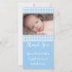 Dankeskarten. Danke von den stolzen Eltern für die besten Wünsche und Geschenke, die Sie für Ihren neuen Baby Jungen erhalten haben. Ersetzen Sie die Fotos vorne und hinten durch Ihre eigene und ändern Sie den Text in Anzug. Blau-weißer Gingham, kariert, Karo-Muster und weißer Text.