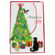 Auf jeder Seite dieses Holiday-Geschenksacks sitzt eine seltsame schwarze Katze neben einem Holiday-Baum und beobachtet, wie eine Stierkampfarena darauf landet. Britisch verpackte Geschenkpakete sind verstreut. Der rote und grüne Text sagt "Christmas JOY". Niedlich!