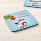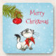 Ein lustiges und niedliches Untersetzer Set mit Weihnachten. Eine schelhafte und verspielte weiße siamesische Katze. Sie schaut sich eine Weihnachtsbaumdekoration an, die an einem Kiefernzweig hängt und fragt sich, ob sie frech sein und damit spielen sollte oder nicht. Im Text heißt es frohe Weihnachten in einem skurrilen Schriftart. Set auf blauem Hintergrund mit weißen Schneeflocken.