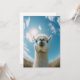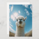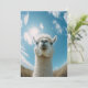 Ein charmantes Alpaca-Pärchen kommt neugierig in die Kamera, in einer lustigen Fischperspektive aufgenommen. Der hellblaue Himmel und weiche Wolken sorgen für eine reizvolle Kulisse, während die Sonne über dem Himmel scheint und dieser zauberhaften Szene ein fröhliches Glühen verleiht.
