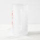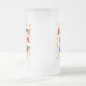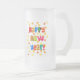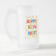 Eine Mattierte Tasse aus Glas aus Neujahr mit "Happy New Year" in bunten Buchstaben und orange und gelb beginnt überall auf dem weißen Boden verstreut. Von Judy Adamson entwarf eine handbemalte Collage.