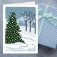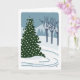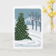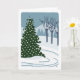 Winterlandschaft mit Schnee, Bäumen und abgelegenen Hügeln. Der Baum vorne hat überall festliche Lichter. Digitale Zusammensetzung handgemalten Acryls auf Papier. Diese moderne Illustration enthält die Farben blau, grün, weiß, creme. Innen: Happy New Year
