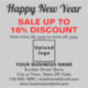 Alles Gute zum neuen Jahr! Ein Neuanfang. Ein Neubeginn. Feiern Sie diesen Januar und werben Sie auch für Ihr Geschäft. Maßgeschneiderter quadratischer Vinyl Aufkleber mit Neujahrsverkauf, Ihrem Firmennamen und weiteren Informationen. Vinyl Aufkleber, dass Sie als Marketing Material verwenden können, um mehr Kunden anzuziehen. Anpassen und anzeigen, um mehr Kunden davon zu überzeugen, Ihre Produkte oder Kunden zu kaufen, um Ihre Dienstleistungen zu mögen. Designfarben sind schwarze und rote Texte auf grauem Hintergrund. Inhalte sind glücklicher Neujahrsgruß, Verkaufstexte mit prozentualem Rabatt, die Sie anbieten, Verkaufstermine, Ihr Firmenname, Logo, Adresse, Telefonnummer, E-Mail und Website oder Ihre Business Social Media-Seite. Bitte Karo des Erscheinungsbildes nach dem Hochladen von Logos und Schriftzeichen. Wenn Ihnen das Aussehen gefällt, können Sie jetzt Ihre Bestellung aufgeben. Wenn Sie das Logo und die Texte ändern und verschieben müssen, um auf diesen Aufkleber oder auf die gewünschte Größe zu passen, ändern Sie bitte das Design-Tool. Sie können auch die Hintergrundfarbe, die Farbe des Schriftartes und den Stil des Schriftartes im Designwerkzeug ändern. Alles Gute zum neuen Jahr! Wir wünschen Ihnen mehr Umsatz in diesem Urlaub und den kommenden Jahren.