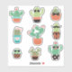 Ein cooles Kakteen-Aufkleber mit neun verschiedenen Kakteen in verschiedenen Grüntönen und einer Auswahl an Accessoires. Eine bespitzelte Kaktus zeigt ihre hübschen rosa Blume. Eine andere coole Kaktus trägt ihre Sonnenbrille mit Haltung über ihren stacheligen Spitzen. Ein grüner Kaktus hat eine herzförmige Sonnenbrille, während ein anderer eine Monokel- und Bogen-Krawatte trägt, seine Blume wie eine hellgrüne Krone. Alle sitzen in verschiedenen Blume Töpfe in Terrakotta, Schwarz und Türkis.