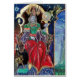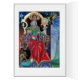 Farbenfrohe, lebendige, zeitgenössische Malerei in Gold, blau, rot, grün, braun . Ein mysteriöser hypnotischer Zauberer mit eleganten Kostümen aus rotem Samt mit einer magischen Kugel, die auf einem gotischen Thron mit Gargostilen und einer Eule sitzt. Ambient ist surreal, fantastisch, alchemisch, wo Sie sehen, wie ein Jester aus einer Tasse trinkt, ein templare Mönch fliegt auf einem Frosch, transparente Blasen, Fantasielandschaften mit Hölle Feuer, kosmisch blauer Himmel mit Sternen, Berge des Himmels, Bäume .Egg Tempera auf Holzplatte mit goldener Folie. 1989 , Miniatur Made mit malerischen Techniken von 1300 von Alessandro Lumini (c) Es ist auch ein schönes Fantasy-Design für Weihnachten, Feiertag, Geburtstag, Silvester Tag, Mardi Gras und Karneval Grüße.
