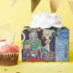 Farbenfrohe, lebendige, zeitgenössische Malerei in Gold, blau, rot, grün, braun . Ein mysteriöser hypnotischer Zauberer mit eleganten Kostümen aus rotem Samt mit einer magischen Kugel, die auf einem gotischen Thron mit Gargostilen und einer Eule sitzt. Ambient ist surreal, fantastisch, alchemisch, wo Sie sehen, wie ein Jester aus einer Tasse trinkt, ein templare Mönch fliegt auf einem Frosch, transparente Blasen, Fantasielandschaften mit Hölle Feuer, kosmisch blauer Himmel mit Sternen, Berge des Himmels, Bäume .Egg Tempera auf Holzplatte mit goldener Folie. 1989 , Miniatur Made mit malerischen Techniken von 1300 von Alessandro Lumini (c) Es ist auch ein schönes Fantasy-Design für Weihnachten, Feiertag, Geburtstag, Silvester Tag, Mardi Gras und Karneval Grüße.