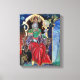 Farbenfrohe, lebendige, zeitgenössische Malerei in Gold, blau, rot, grün, braun . Ein mysteriöser hypnotischer Zauberer mit eleganten Kostümen aus rotem Samt mit einer magischen Kugel, die auf einem gotischen Thron mit Gargostilen und einer Eule sitzt. Ambient ist surreal, fantastisch, alchemisch, wo Sie sehen, wie ein Jester aus einer Tasse trinkt, ein templare Mönch fliegt auf einem Frosch, transparente Blasen, Fantasielandschaften mit Hölle Feuer, kosmisch blauer Himmel mit Sternen, Berge des Himmels, Bäume .Egg Tempera auf Holzplatte mit goldener Folie. 1989 , Miniatur Made mit malerischen Techniken von 1300 von Alessandro Lumini (c) Es ist auch ein schönes Fantasy-Design für Weihnachten, Feiertag, Geburtstag, Silvester Tag, Mardi Gras und Karneval Grüße.