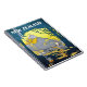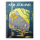 Neuseeland, ein Wendelheft. Die Camper schauen sich das kommende Touristenschiff aus dem Wald an. Vintage Reiseplakat auf einem Notebook.
