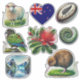 Neuseeland Kiwiana Set 2 Aufkleber. © Pick a Sticker. Auf diesem 8 Aufkleber-Blatt befinden sich alle Kiwiana aus Neuseeland, die stilisierte Bilder eines Schafes, eine Rugby-Kugel, einen Kia-Vogel, einen Kiwi-Vogel, eine Pohutukawa-Blume, eine Herz-NZ-Flagge, eine raue Farn-Frond und eine Wiesengebirgslandschaft enthalten.