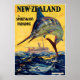 Wiederherstellung und digital verbesserte Reproduktion eines Reiseplakats, das einen Marlin zeigt, der auf einer Angellinie eines Mannes in einem Fischerboot springen und kämpfen kann. Unvollkommenheiten beseitigt. Farben korrigiert.