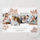 Das einzigartige, moderne Design der Feriencard besticht durch vier beliebte Fotos, die nebeneinander mit übergroßen Rose-Goldfolie-Schneeflocken-Silhouetten im Hintergrund angeordnet sind. Personalisieren Sie Ihren individuellen Urlaubsgruß und Familiennamen unten in klassischer Schrift; gezeigt mit "Joyful Wishs".