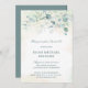 Elegantes Schlucken und sehen Sie Einladung mit eukalyptus-Blätter und Grün mit einem Hauch von Blau und Fetzen von Imitaten Gold Glitzer zusammen mit einem Kreuz an der Spitze. Im Folgenden finden Sie Ihre Veranstaltungsdetails in dunkelgrün, über eine pastellfarbene Aquarellwäsche. Die Rückseite ist in sanft blauem Grün gehalten. Dieses einfache, rustikale Design ist geschlechtsneutral und funktioniert für einen Jungen oder ein Mädchen.
