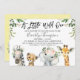 Neutrale Safari Tiere Baby Dusche Einladung geschlechtsneutrale Safaritiere Baby Dusche Einladung mit vier Dschungeltieren, einige rosa Blumenarrangements und ein bisschen Blattwerk. Auf diese Weise können die Gäste zu einer geschlechtsneutralen Babydusche mit Safari-Thema eingeladen werden. Das gleiche Design gibt es auch für eine kleine Dusche für Mädchen.