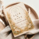 Ein romantisches, vintage-inspiriertes Design mit weichen Wildblumen, goldenen Weizenstielen und leuchtenden Laternenakzenten, die einen warmen Pergamenthintergrund einrahmen. Zarte botanische Details und erdige Neutraltöne schaffen eine zeitlose Landatmosphäre mit einer verfeinerten rustikalen Note. Die symmetrische Garteneinfassung verleiht Eleganz, während der Gesamteindruck weich und einladend bleibt. Perfekt für eine Freiluftzeremonie, eine Weinbergfeier oder eine romantische Garteneinstellung mit klassischem Charme.
