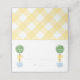 Handgemalte Boxholz Topiary Ball mit gelbem Bogen und in einer Ingwer-Pfanne. Die Rückseite ist mit einem frischen, gelb-weißen Gingham-Karo dekoriert.