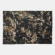 Ein Muster aus glänzenden, ruchenden, goldglatten Zweigen vor schwarzem Hintergrund mit Flecken festlicher Glitzer-ähnlicher Konfetti.