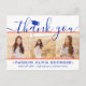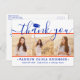 Schicken Sie uns eine stilvolle Dankeschön mit einem maßgeschneiderten 3 Foto Collage Orange, Blau und Weiß Abschluss danke Ihnen Postkarten. Alle Bilder und Texte sind einfach zu personalisieren. (IMAGE PLACEMENT TIP: Eine einfache Möglichkeit, ein Foto genau so zu zentrieren, wie Sie es gewollt haben, ist es, es einzuschneiden, bevor Sie es auf die Zazzle-Website hochladen.) Diese Vorlage kann mit jedem beliebigen Wortlaut Ihrer Wahl, wie z.B. zukünftige Bildungen, neue Stellenangebote oder ein beliebiges inspirierendes Angebot, angepasst werden. Wenn Sie lieber Ihre Nachricht schreiben, löschen Sie einfach den Beispieltext oder verwenden Sie den zusätzlichen Platz über der neuen Adresse und Kontaktinformationen. Das Design zeichnet sich durch einen schlichten, weißen Hintergrund, eine blaue Mörtel-Kappe, handgeschriebene Schrift-Kalligraphie, moderne minimalistische Typografie und drei Fotos Ihrer Wahl aus, wie Seniorbilder oder Bilder aus der Anlaufzeremonie. Diese eleganten personalisierten Karten sind eine schicke und trendige Möglichkeit, Familie und Freunden zu danken, dass sie ihren Abschluss gemeinsam feiern. Herzlichen Glückwunsch an den Absolventen!