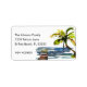Eine tropische Aquarellpalme lehnt sich über das Wasser auf dieser Süd/Florida thematischen Änderung des Adressetiketts. Die Szene umfasst auch ein Holzsteg, typisch für Zuhause auf Binnenwasserstraßen. Der Text ist für Ihre persönlichen Gruß- und Kontaktdaten anpassbar.