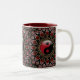 Hübsche Farben geometrische Mandala in tiefrot und goldfarben auf schwarz mit 3 roten und schwarzen Yin Yang Symbol für Balance