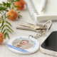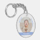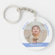 Trendiger, klassischer personalisierter Schlüsselanhänger für Zwillingsjungen mit einem weißen Rahmen mit einer runden Öffnung für ein maßgeschneidertes horizontales Foto, und einer gebogenen blauen Band auf jeder Seite, auf der der Name oder die Namen der Zwillinge in einem eleganten Drehbuch Schriftart / Typografie erscheint. Beachten Sie, dass Sie wählen können, um diesen Schlüsselanhänger Single-seitig zu kaufen. Dieses Design enthält die Worte "Wir Liebe Sie, Opa Jason!", die Sie personalisieren oder löschen können.